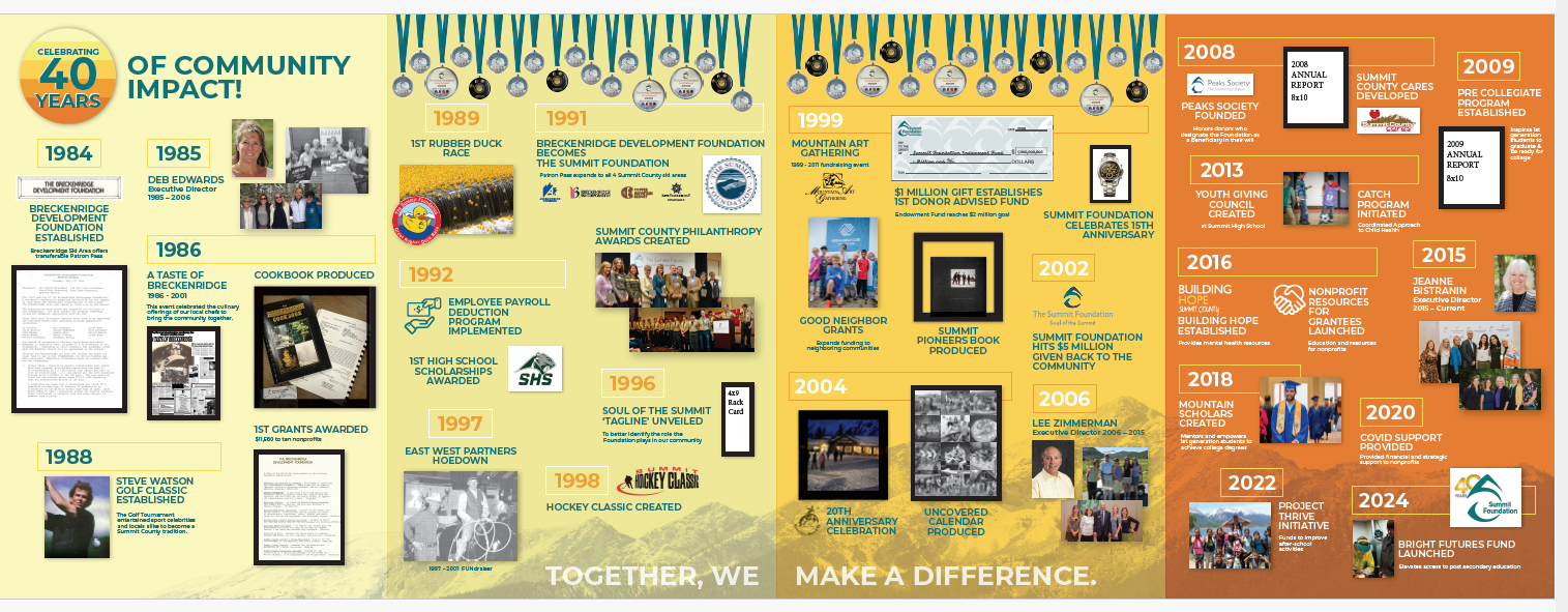 The Summit Foundation is proud to celebrate 40 years of dedication to enhancing the quality of life in Summit County and neighboring communities. To mark this milestone, the Foundation will host its 40th Anniversary Soiree on Friday, July 26, 2024, from 5:30 pm to 10:00 pm in the Bighorn Room at the Copper Mountain Resort Conference Center.